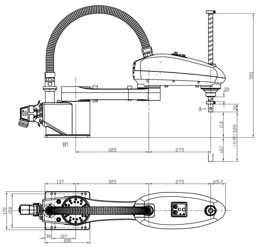 The motion range and installation dimensions diagram